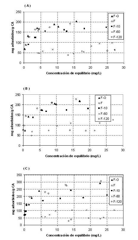 圖2.苯并噻唑在活性炭上的吸附等溫線。(A)BT,(B)MeBT,(C)OHBT。