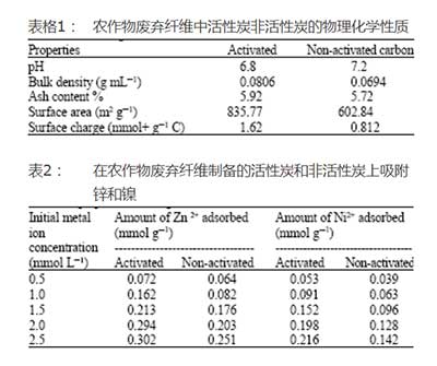 由農作物纖維制備的活性炭已經用于在初始金屬離子濃度范圍內吸附Ni2+和Zn2+。從結果中,發現金屬離子的吸附容量為:Zn2+>Ni2+。這一結果表明,這種纖維是一種無商業價值的農業副產品,可用于清除水性廢水中的金屬離子。因此,通過這一過程,用于常規污水處理的商業活性炭或其他化學品所花費的資金要少很多并且難呢過有效利用廢物。